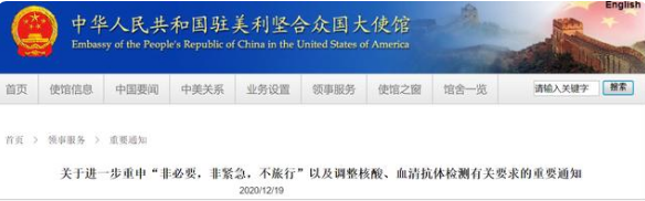 中國駐美國大使館12月19日發(fā)布通知,近期從美國輸入中國的新冠確診病例大量增加,經(jīng)查,多數(shù)確診病例與旅途中轉(zhuǎn)感染有關(guān),部分也與中介機(jī)構(gòu)、實(shí)驗(yàn)室存在違規(guī)操作以及檢測后不能遵守居家隔離要求有關(guān)。截至12月18 日,美國疾病控制與預(yù)防中心(CDC)統(tǒng)計(jì)的美國確診病例已近1700萬例,CDC并預(yù)計(jì)2021年1月初仍可能會有每周120萬至230萬例新增報告病例。為保護(hù)中外乘客和航空公司乘務(wù)人員健康和生命安全,筑牢外防輸入防線,根據(jù)國內(nèi)******要求,駐美國使領(lǐng)館現(xiàn)再次提醒大家慎重考慮疫情期間的感染風(fēng)險,務(wù)必牢記“非必要,非緊急,不旅行”。同時,對確有緊急旅行需要的乘客進(jìn)行新冠病毒核酸檢測、血清抗體檢測相關(guān)要求作出進(jìn)一步規(guī)范和說明: